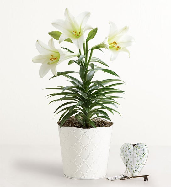 NEW Our Easter lily brings timeless beauty to the holiday celebration. Featuring large white, trumpet-shape flowers and a delightful fragrance, this signature spring plant arrives budding and ready to bloom in white planter with a spiral scalloped design. Add to their gift a heart-shape keepsake decorated with flowers and a cross.