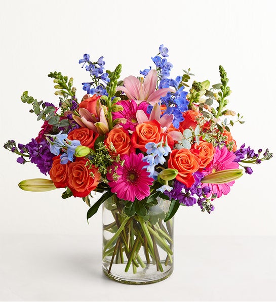 A fresh-from-the-meadow design makes this colorful bouquet a true delight. Orange roses, blue delphiniums, and more vibrant blooms come together with lush greenery to create a summertime standout certain to lift their spirits.