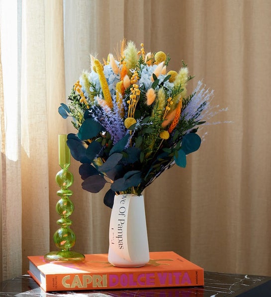 This arrangement features preserved flowers in gentle sky blue, gold, and apricot shades, offering enduring beauty without needing water.