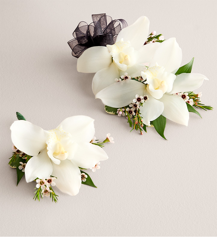 NEW Our white cymbidium orchid corsage and matching boutonniere are the ultimate in elegance and will complement just about any color or style of formalwear. Each boutonniere features one pristine orchid accented with white waxflower and assorted greenery. The corsages are available in two sizes, can be worn on the wrist or pinned to clothing, and come with a ribbon bow in your choice of white, silver, gold, or black.
